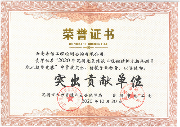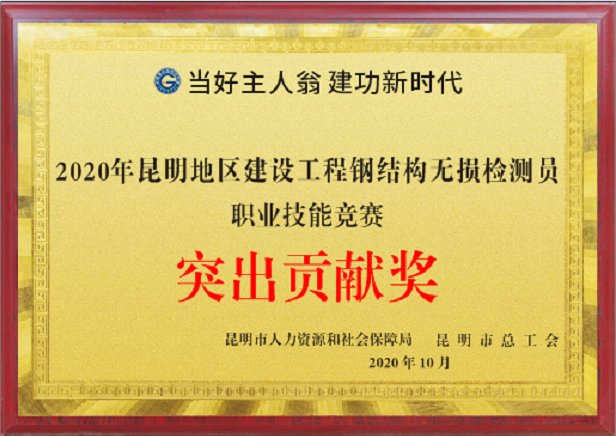 同時(shí),我司作為技術(shù)支持單位協(xié)助云南省工程檢測(cè)協(xié)會(huì)舉辦了2020年昆明地區(qū)建設(shè)工程鋼結(jié)構(gòu)無(wú)損檢測(cè)員職業(yè)技能競(jìng)賽活動(dòng)。此次技能競(jìng)賽選拔出了一批技藝精湛、善于解決技術(shù)難題的技術(shù)尖兵,不僅使檢測(cè)機(jī)構(gòu)有效地判斷自身鋼結(jié)構(gòu)無(wú)損檢測(cè)的水平,取長(zhǎng)補(bǔ)短,也促進(jìn)昆明市地區(qū)建筑工程檢測(cè)行業(yè)鋼結(jié)構(gòu)檢測(cè)整體水平的提升。在此次技能競(jìng)賽活動(dòng)中我司提供了大力支持、表現(xiàn)突出,因此獲得了由昆明市人力資源和社會(huì)保障局、昆明市總工會(huì)頒發(fā)的突出貢獻(xiàn)獎(jiǎng)獎(jiǎng)牌和榮譽(yù)證書。