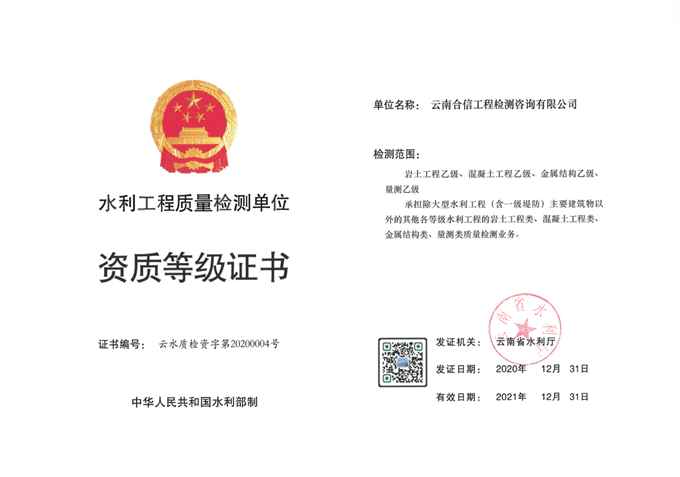“水利工程質(zhì)量檢測(cè)單位乙級(jí)資質(zhì)”的取得,是云南省水利廳對(duì)云南合信公司檢測(cè)能力的充分肯定,標(biāo)志著公司的服務(wù)能力進(jìn)一步增強(qiáng),綜合競(jìng)爭(zhēng)力進(jìn)一步提高,為公司跨領(lǐng)域、跨區(qū)域發(fā)展打下了良好的基礎(chǔ)。