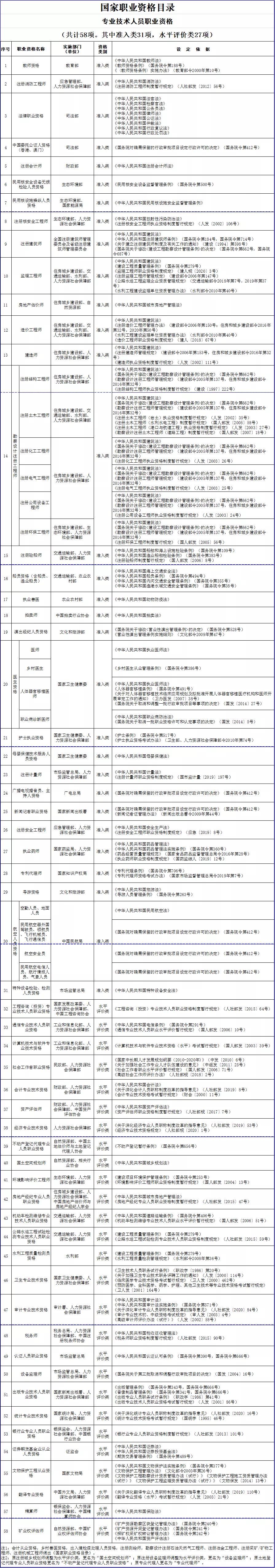 為貫徹落實國務院“放管服”改革要求,結合近年來國務院有關部門職責調整、行政審批事項改革等情況,擬對2017年公布的《國家職業資格目錄》專業技術人員職業資格部分進行調整。調整后,擬列入專業技術人員職業資格58項,其中,準入類31項,水平評價類27項。現將調整后的《國家職業資格目錄(專業技術人員職業資格)》予以公示,公示期7天。如有意見建議,請于2021年1月19日之前將署名意見建議反饋至郵箱zjszhichengchu@163.com。