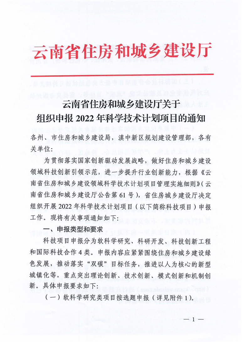 云南省住房和城鄉建設廳關于組織申報2022年科學技術計劃項目的通知